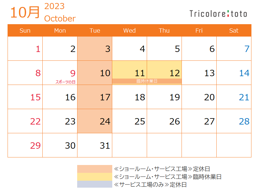 10月定休日のご案内