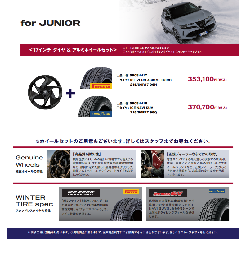 本日は、各タイヤメーカーの最新技術を採用したスタッドレスタイヤと、当社の厳しい基準をクリアした純正ホイールを組み合わせた...