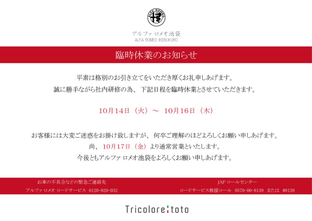 ~休業日のお知らせ~ 10月14日 (火) 、10月15日 (水) 、10月16日 (木)