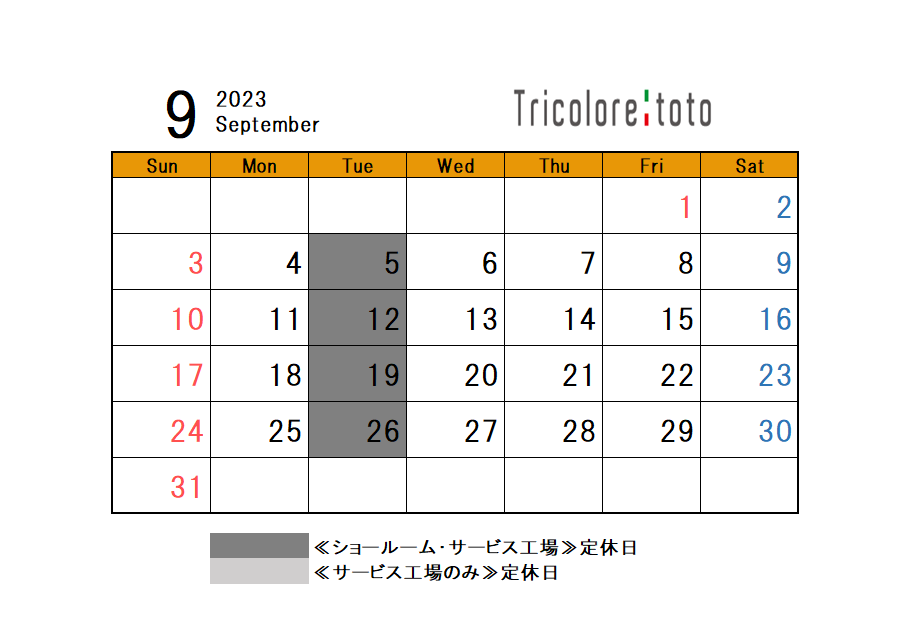 9月定休日のご案内