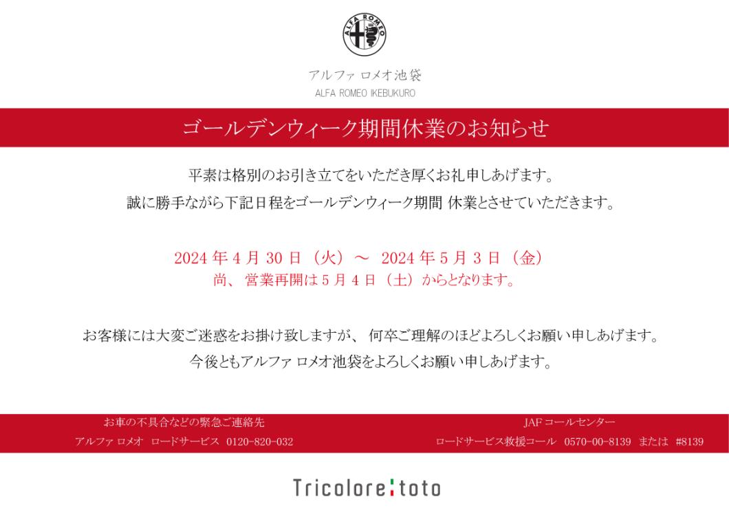 平素より、アルファ ロメオ池袋をご愛顧賜り、誠にありがとうございます。 誠に勝手ではございますが、GW期間中、下記の日...