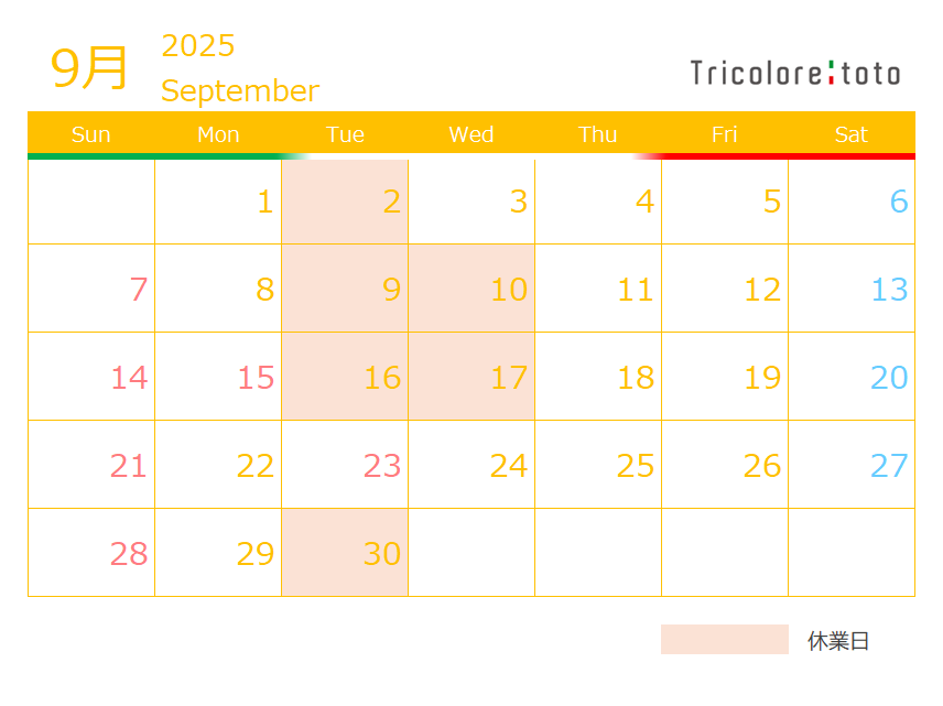 9月定休日のご案内