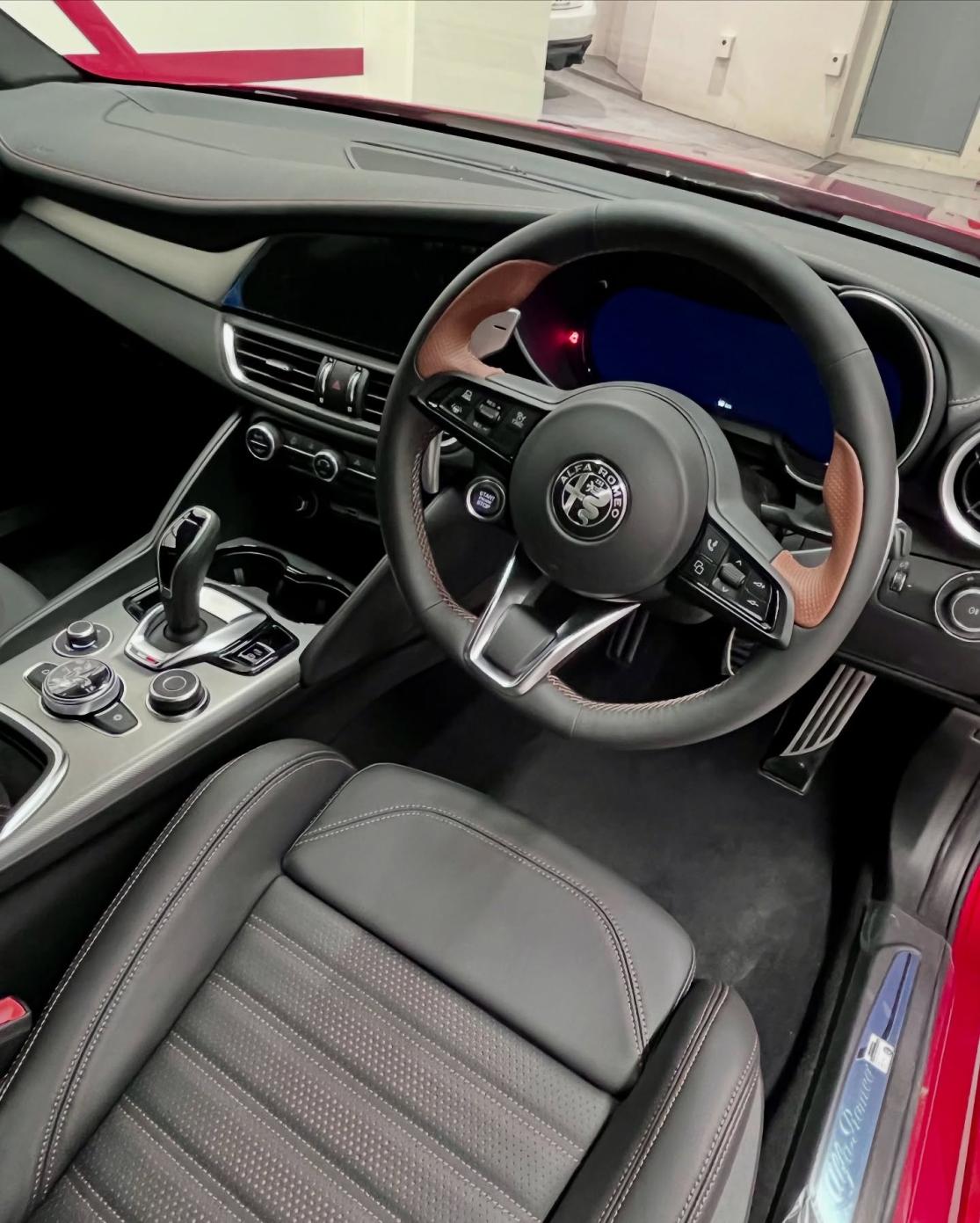 『𝖨𝗇𝗍𝖾𝗇𝗌𝖺』は、イタリア語で「強烈な」「情熱的な」「力強い」「深い」といった意味を持ち、アルファ ロメオの情熱と美学を象徴する限定シリーズです。外装には「勝利」「価値」「独創性」といったアルファ ロメオの哲学を象徴するゴールドのアクセントが施され、彫刻的なボディラインにさらなる存在感と気品を与えます。また、インテリアでは、タンカラーのステッチをあしらったブラックアルカンタラシートや、スポーツレザーを採用したステアリングにはタンカラーアクセントが施され、細部に至るまでクラフトマンシップが息づいています。